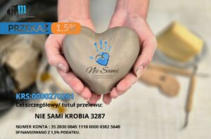 Twój 1,5% podatku to dla nas coś więcej niż liczba w deklaracji. To podróże, które otwierają świat. To pomoc dydaktyczna, która daje samodzielność. To rozwój, radość i poczucie, że nie jesteśmy sami. Wspieracie nas również, kupując piękne wyroby ceramiczne. Przekazując 1,5% podatku na Stowarzyszenie Osób Niepełnosprawnych „NIE SAMI”, realnie wspierasz naszych uczestników w codziennym życiu, nauce i realizowaniu marzeń. Nic Cię to nie kosztuje, a może zmienić bardzo wiele. Wystarczy chwila przy rozliczeniu PIT. Dziękujemy za każdy gest, każde udostępnienie i każdy procent, który zamienia się w pomoc. Sami nie możemy zmienić świata, ale razem mamy szansę choć trochę go zmienić na lepsze.